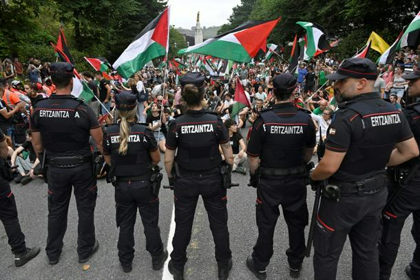 Basque regional police officers stand as pro-Palestinian protesters demonstrate following the Vuelta 11th stage in Bilbao on September 3, 2025